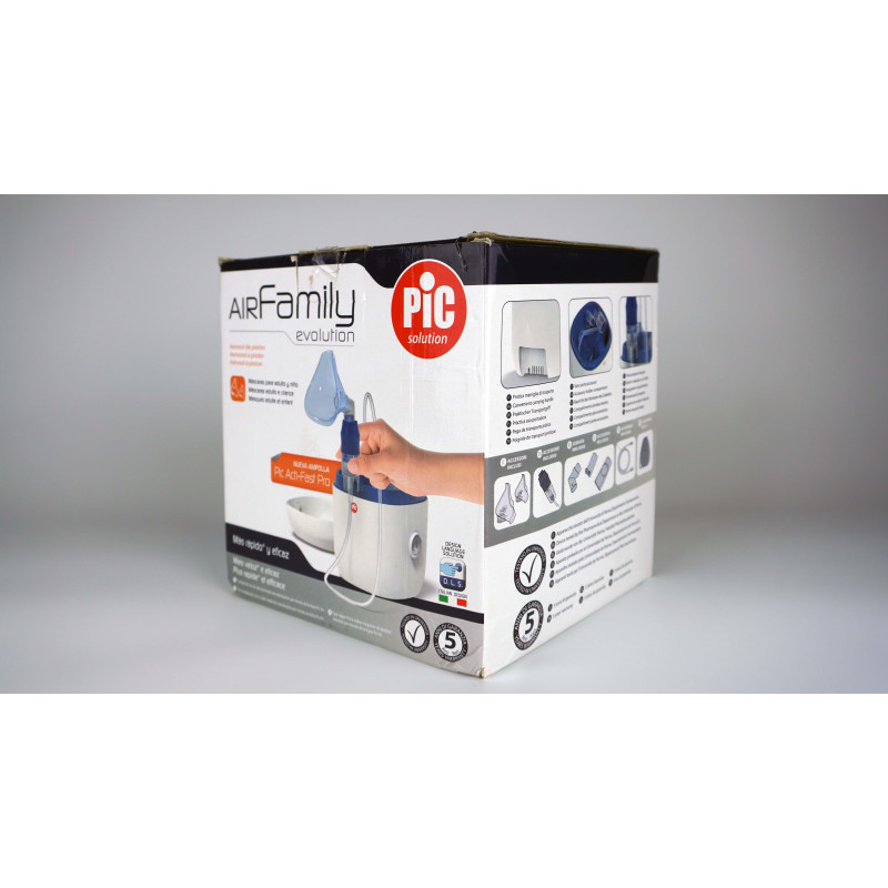 PIC AirFamily to zaawansowany technologicznie, szybki i efektywny inhalator, stworzony dla całej rodziny. Umożliwia terapię dróg oddechowych dzieci i dorosłych z użyciem soli fizjologicznej oraz leków przeznaczonych do nebulizacji. Upraszcza i przyspiesza każdy etap terapii nebulizacyjnej, od przygotowania do przechowywania. Pod pokrywą inhalatora znajduje się schowek na akcesoria (maska dla dorosłych, maska dla dzieci, rurka, komora, ustnik, wkładka do nosa)