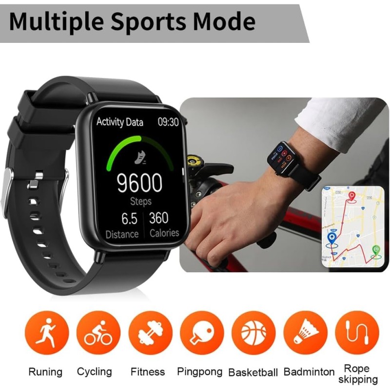 Wiele trybów sportowych i wodoszczelność IP68: Smartwatch jest wyposażony w wiele różnych trybów sportowych: bieganie, jazda rowerze, fitness, tenis stołowy, koszykówka, badminton, skakanka itd. Smartwatch ma doskołą wodoodporność i może zaspokoić większość codziennych potrzeb. Wskazówka: nie leży nosić zegarka do nurkowania lub do gorącej kąpieli wodnej lub sauny.