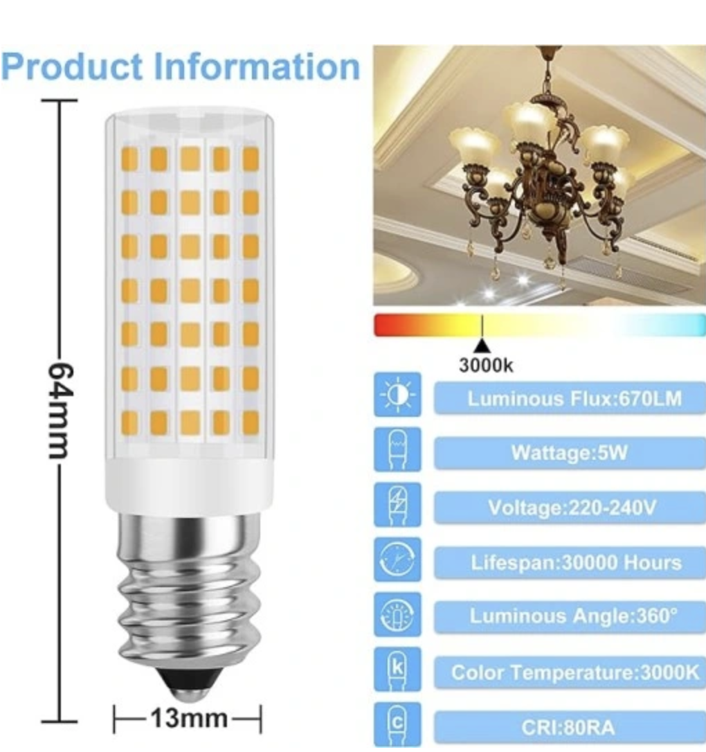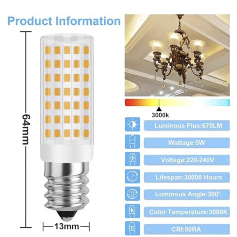 Wydajne oszczędzanie energii Oszczędzaj ponad 90% energii elektrycznej, oświetlenie lodówki wykorzystuje wysokiej jakości SMD, a dioda LED E14 o mocy 5 W odpowiada żarówkom halogenowym o mocy 50 W, co może pomóc Ci zaoszczędzić więcej energii